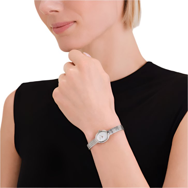 Mini's MWSMS-M05 er udstyret med en perlemor urskive, en urkasse i rustfrit stål og en rem i rustfrit stål.