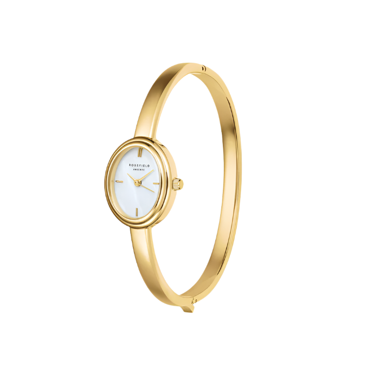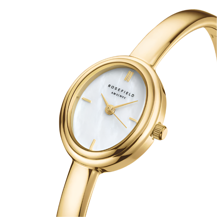 Studio Bangle fra Rosefield er et elegant statement-piece, der kombinerer tidløs form med moderne raffinement. Det aflange urkasse-design måler 19,5 x 23,5 mm og fuldendes af en hvid perlemorsskive, der tilføjer en blød og sofistikeret glød. Urkassen og lenken er fremstillet i rustfrit stål belagt med 23 karat guld, hvilket giver uret et eksklusivt og luksuriøst udtryk.