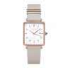 The Boxy QCGRG-Q028 er udstyret med en hvid urskive, en urkasse i rustfrit stål og en rem i skind.