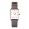 The Boxy QWGR-Q12 er udstyret med en hvid urskive, en urkasse i rustfrit stål og en rem i skind.