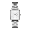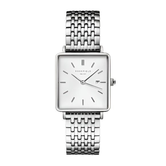 The Boxy QWSS-Q08 er udstyret med en hvid urskive, en urkasse i rustfrit stål og en rem i rustfrit stål.