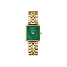 The Boxy XS BEGSG-Q050 er udstyret med en grøn urskive, en urkasse i rustfrit stål og en rem i rustfrit stål.