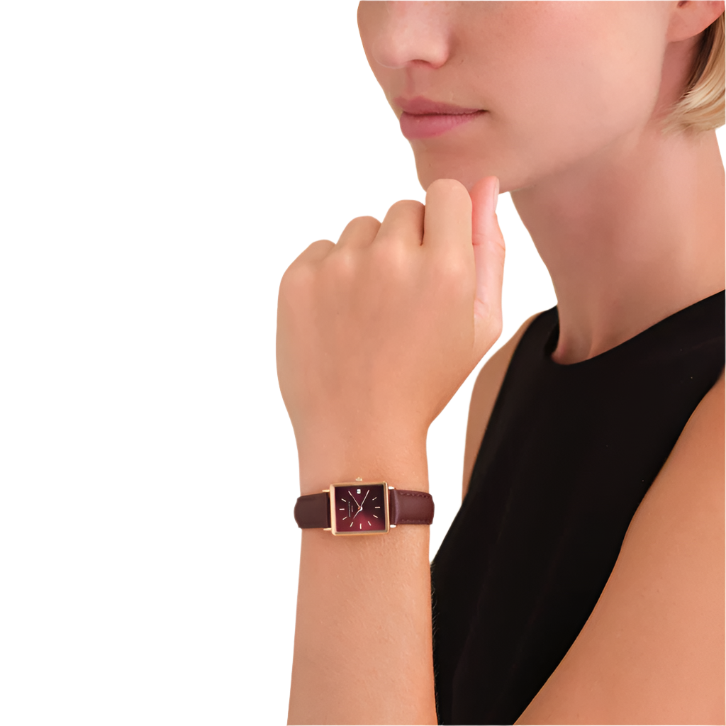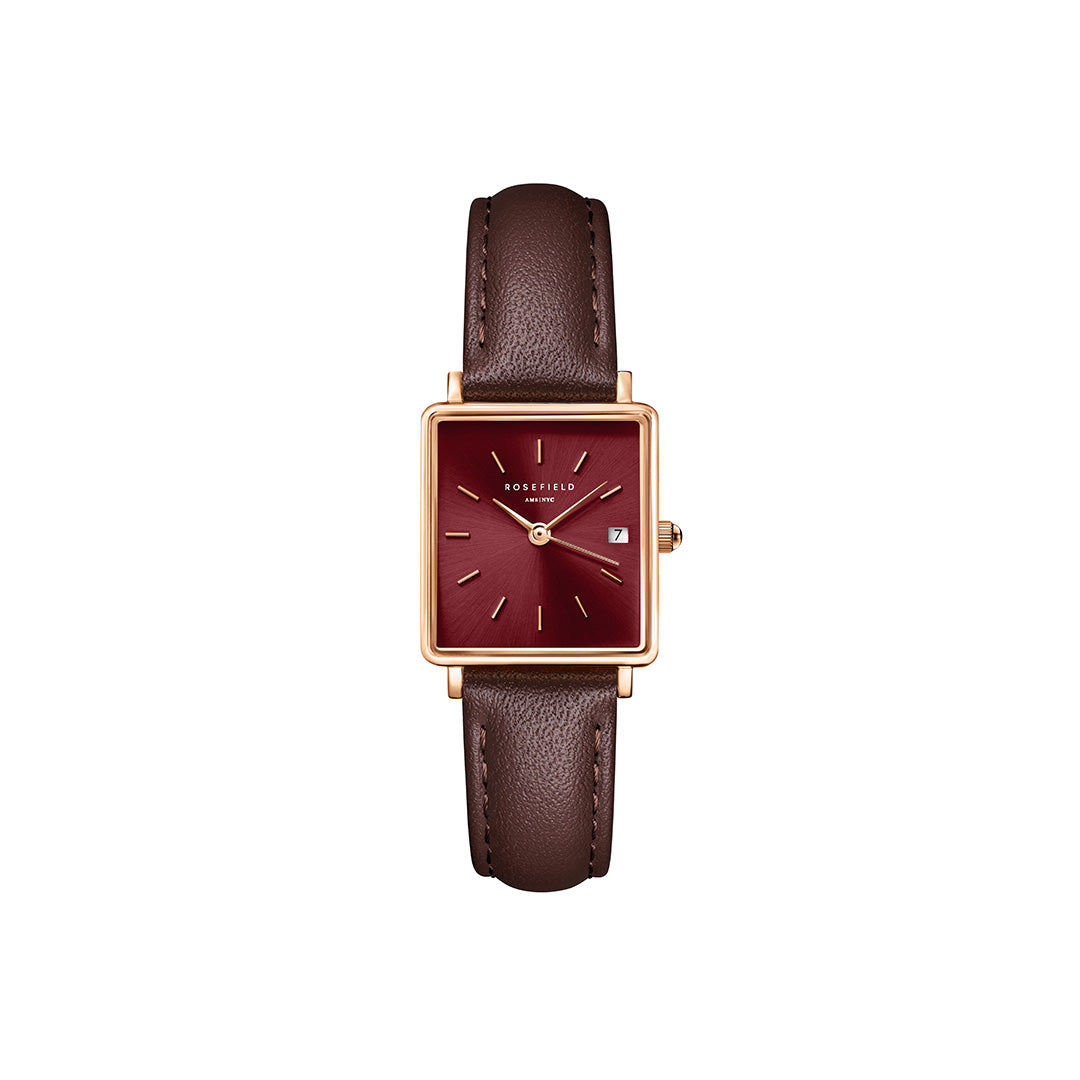 The Boxy XS QBBLR-Q56 er udstyret med en rød urskive, en urkasse i rustfrit stål og en rem i skind.