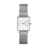 The Boxy XS QMWMS-Q038 er udstyret med en hvid urskive, en urkasse i rustfrit stål og en rem i rustfrit stål.