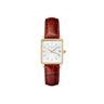 The Boxy XS QWBLG-Q55 er udstyret med en hvid urskive, en urkasse i rustfrit stål og en rem i skind.
