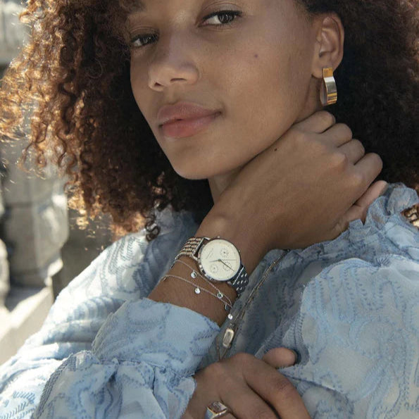 The Gabby NWS-N92 er udstyret med en hvid urskive, en urkasse i rustfrit stål og en rem i rustfrit stål.