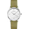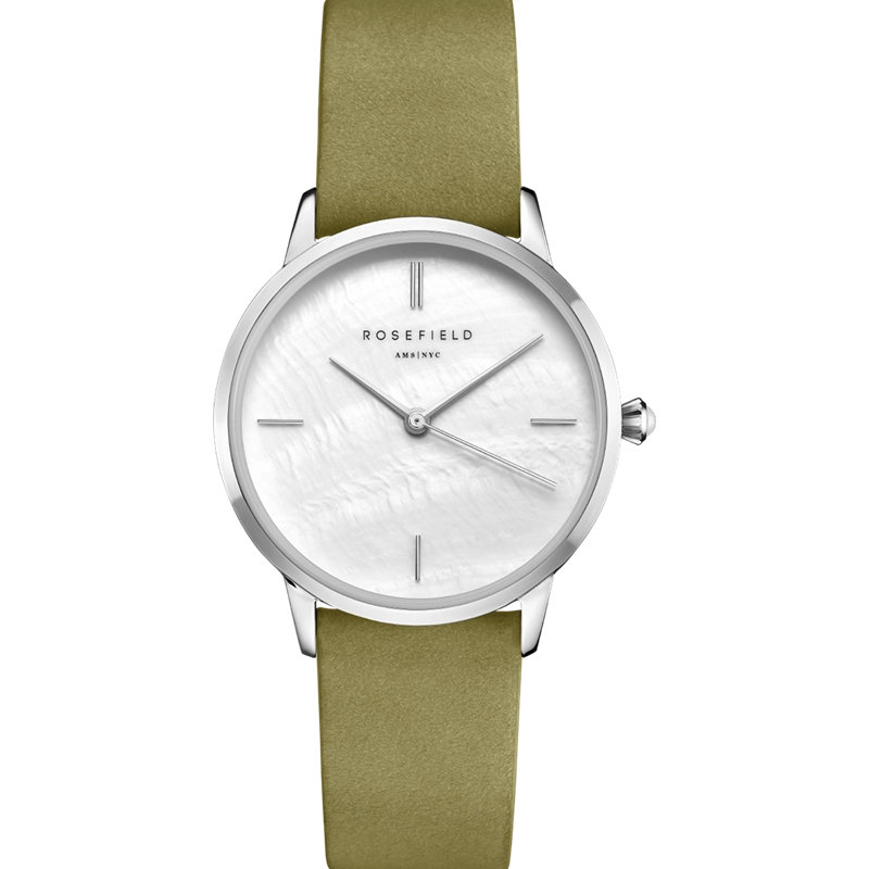 The Pearl Edit RMOLS-R05 er udstyret med en perlemor urskive, en urkasse i rustfrit stål og en rem i skind.