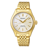 Uret har en hvid urskive, en guldfarvet urkasse, en rem i rustfrit stål, der tilsammen skaber et balanceret og stilfuldt udtryk.