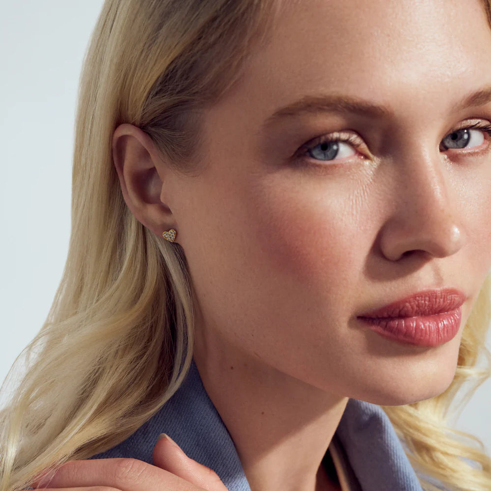 Cuore Øreringene er en romantisk og feminin detalje, der tilfører et strejf af glans til dit look. De hjerteformede ørestikker er fremstillet i forgyldt 925 sterlingsølv og prydet med små, funklende zirkonia, som fanger lyset fra alle vinkler.