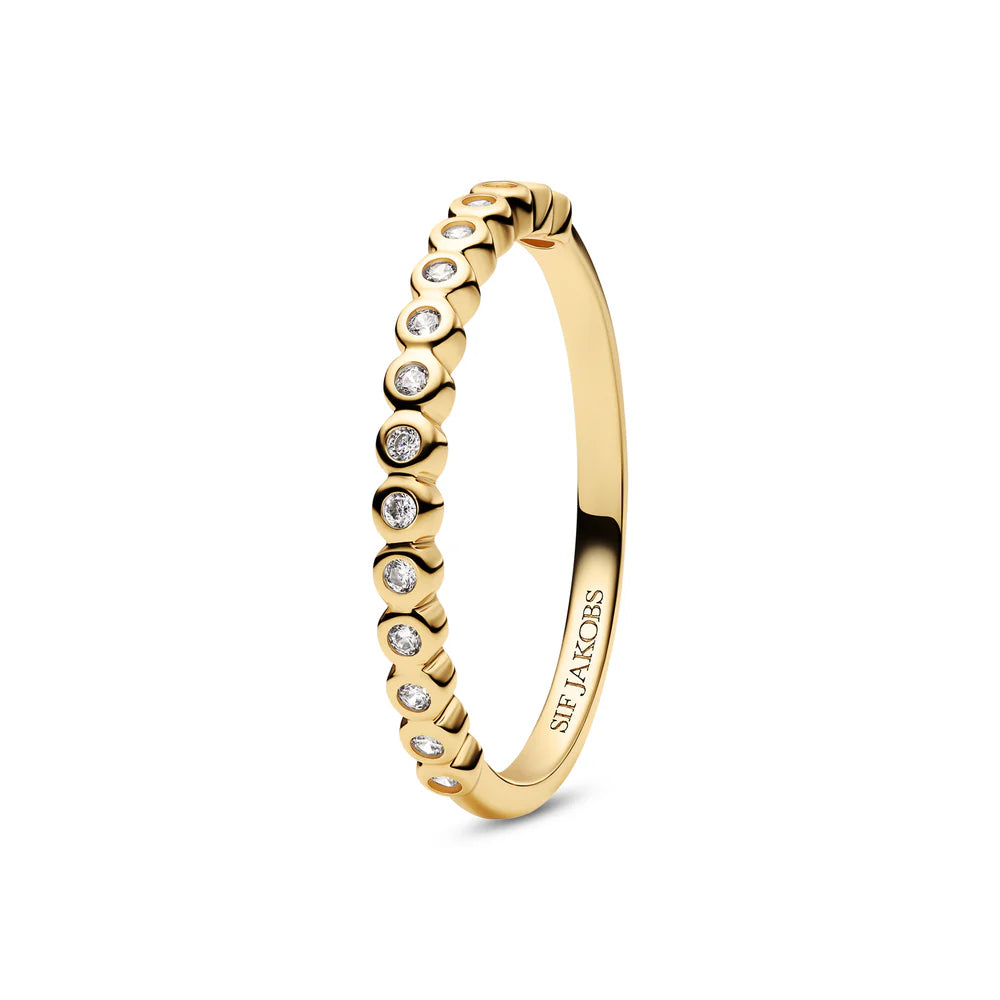 Sarzana ringen i forgyldt sterlingsølv kombinerer klassisk elegance med et legende twist. De små runde zirkonia-sten er diskret indfattet hele vejen rundt i en bølget struktur, der skaber et unikt og iøjnefaldende udtryk.