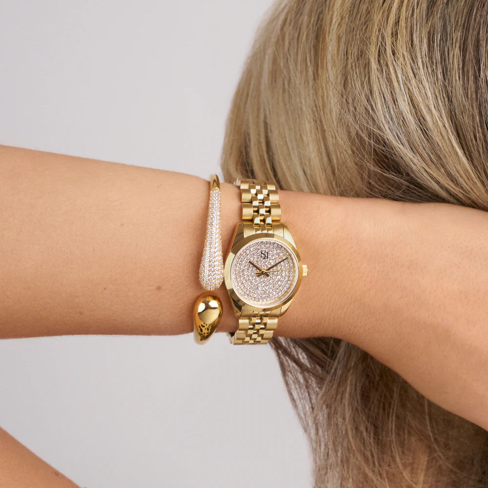 Sophia-uret forener klassisk design med feminine detaljer i en elegant guldbelagt udgave. Uret er fremstillet i rustfrit stål med både polerede og børstede overflader, hvilket giver et eksklusivt og afbalanceret udtryk. Den hvide urskive er smukt dekoreret med hvide zirkoner, som tilfører et diskret, funklende præg.