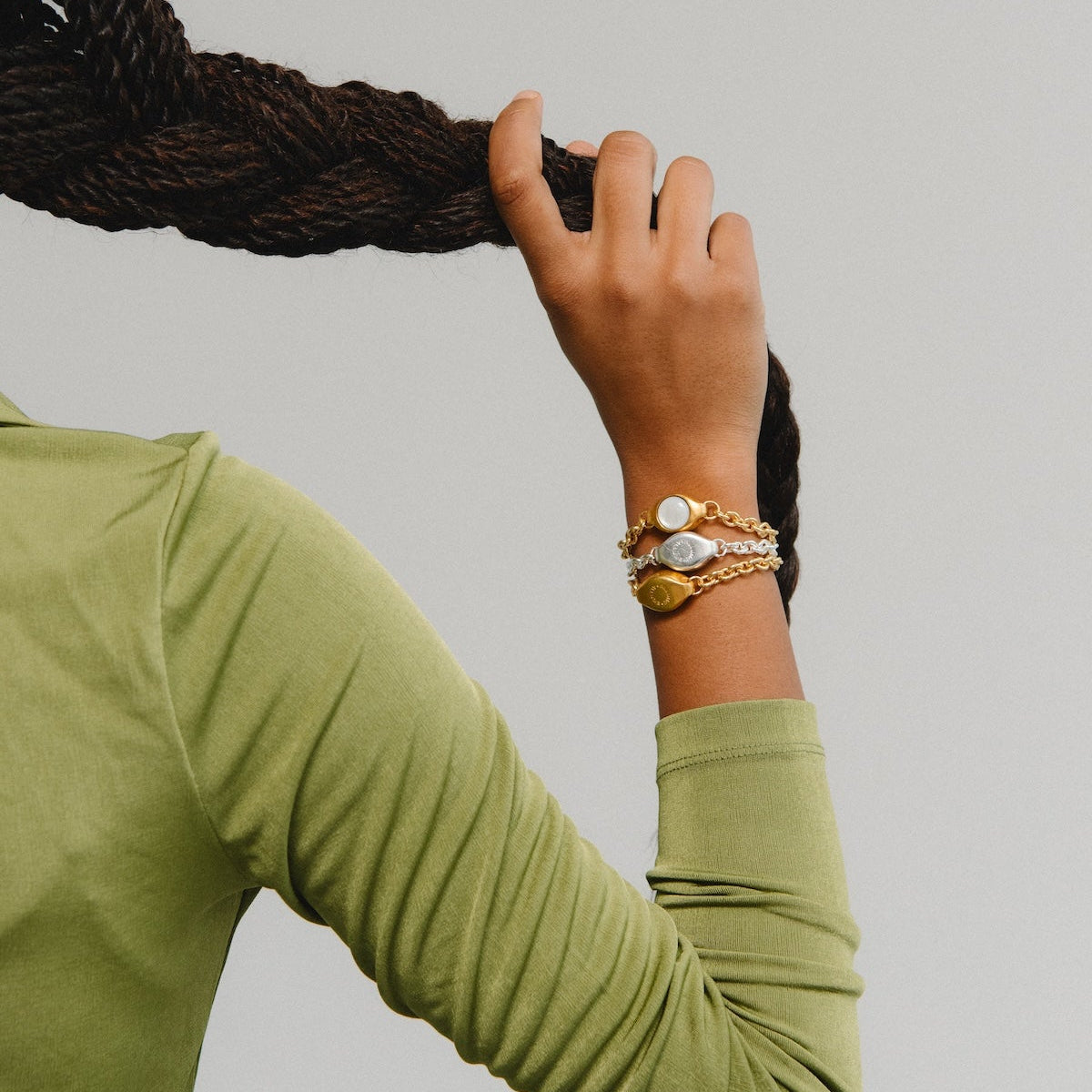 Dette Signet-inspirerede smykke bærer en historisk betydning, men er redesignet som en moderne community favorit. Det endelige look bestemmes af dit personlige valg af sten, og det er ideelt at stacke med andre armbånd eller bære alene.