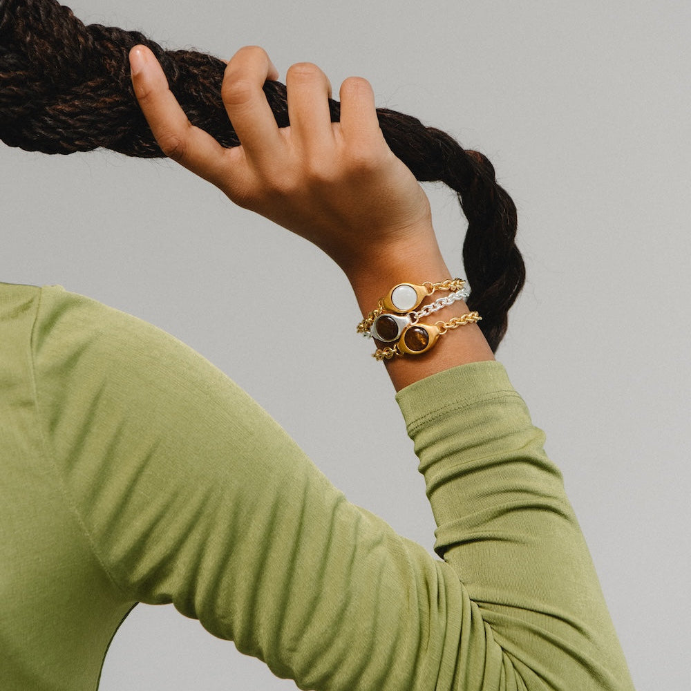 Dette Signet-inspirerede smykke bærer en historisk betydning, men er redesignet som en moderne community favorit. Det endelige look bestemmes af dit personlige valg af sten, og det er ideelt at stacke med andre armbånd eller bære alene.