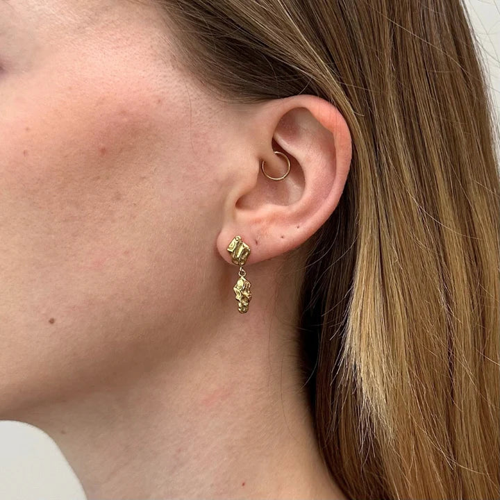 Øreringene skaber et look, der føles både cool og effortless. Guldgløden kombineret med den skulpturelle form og tekstur tilfører øjeblikkelig luksus og kant til dit outfit.