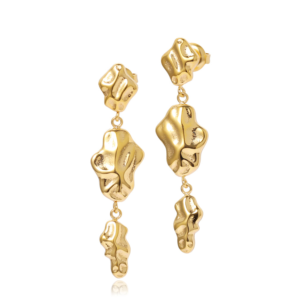 Øreringene er udført i robust rustfrit stål og belagt med en fyldig 18 karat guldplating. Denne kombination giver et luksuriøst, gyldent udtryk samtidig med, at smykket er utrolig holdbart og allergivenligt.