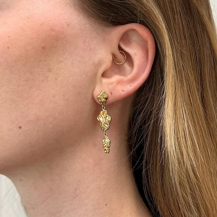 Disse Aria øreringe er skabt til at blive set! Øreringene leger med form, tekstur og attitude, og den varme 18 karat guldplating forstærker det edgy, fashion-forward look, der oser af it-girl vibes.