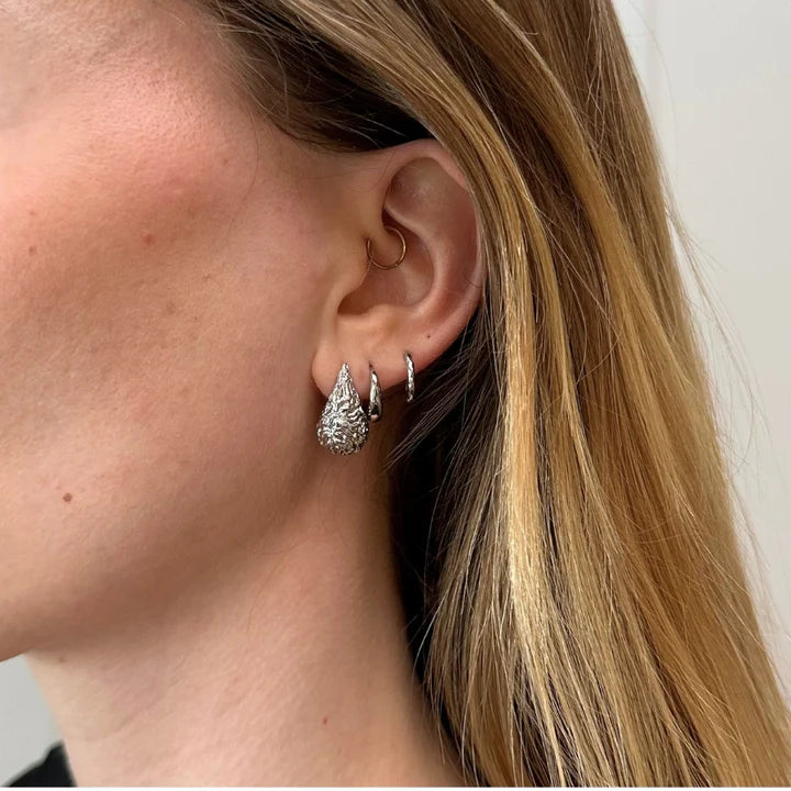 Øreringene er udført i robust rustfrit stål, hvilket sikrer en allergivenlig og utrolig holdbarhed. Den glatte, dråbeformede silhuet suppleres af en raffineret tekstur, der får lyset til at danse og tilfører dybde til det minimalistiske design.