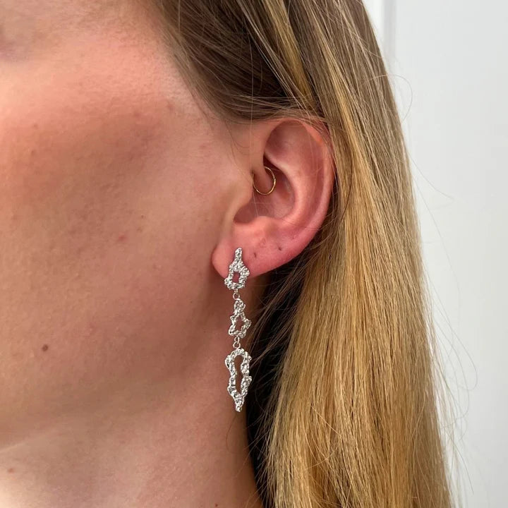 Øreringene er udført i robust rustfrit stål, hvilket sikrer, at det unikke design er utrolig holdbart og allergivenligt. Designet er samlet i flere led, der skaber dynamisk bevægelse og fanger lyset.