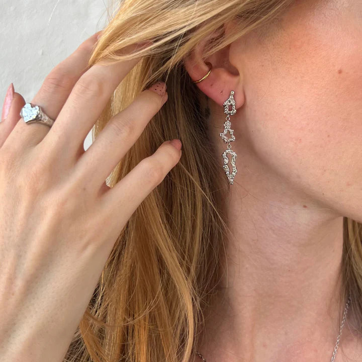 Disse Echo øreringe er et ægte kunstnerisk smykke. De blander organiske former og rå, teksturerede overflader i et design, der føles både skulpturelt og naturligt – som noget, du fandt i en cool vintagebutik i Paris.