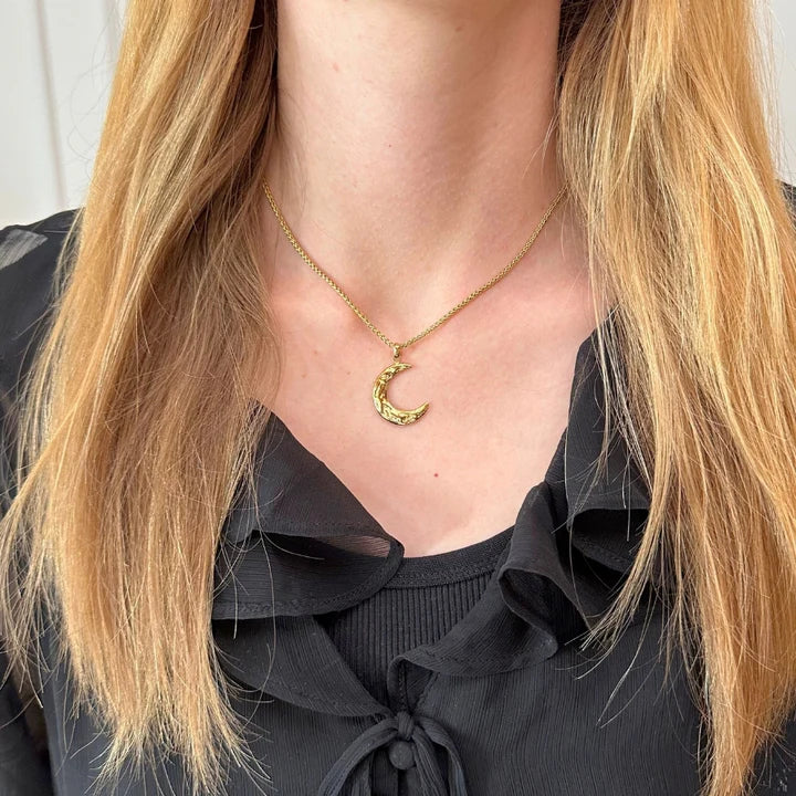Få den ultimative glow-up med Sirena halskæden, prydet med et elegant måne-vedhæng. Dette smykke er legende, let og fuld af energi, og den varme guldglød giver ethvert outfit et boost af positive vibes.