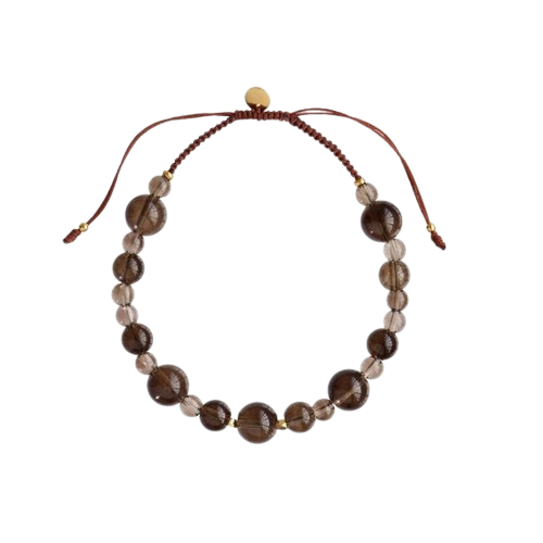 Smukt og klassisk håndknyttet armbånd fra STINE A med røgkvarts-ædelsten i forskellige størrelser. Armbåndet har en nem åbning og lukning, hvilket gør det let at bære og style.