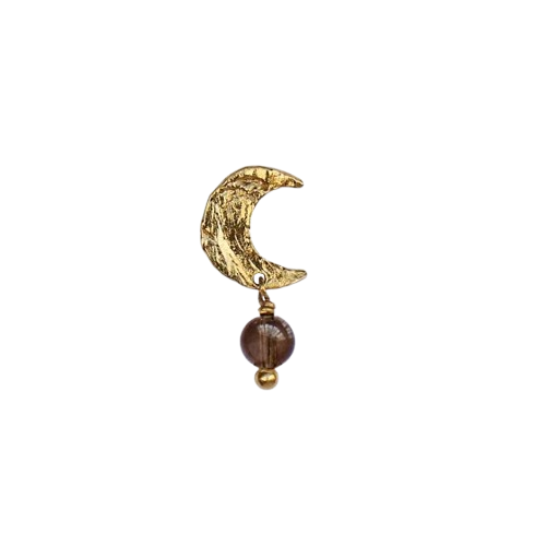Lille og unik ørestik fra STINE A i forgyldt sterlingsølv med et smukt månevedhæng og en lille røgkvarts. Øreringen har en rå, banket overflade, der giver et cool og skinnende udtryk med et strejf af elegance.