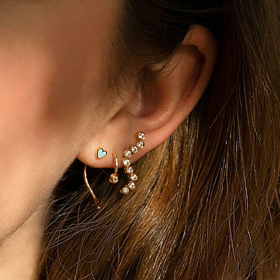 Sød og fin hjerteørering med lyseblå emalje, der giver et farverigt og legende udtryk. Hjertet måler 3 x 3 mm og er fremstillet i 18 karat forgyldt sterling sølv, hvilket giver et varmt og eksklusivt udtryk, der holder sig smukt over tid.