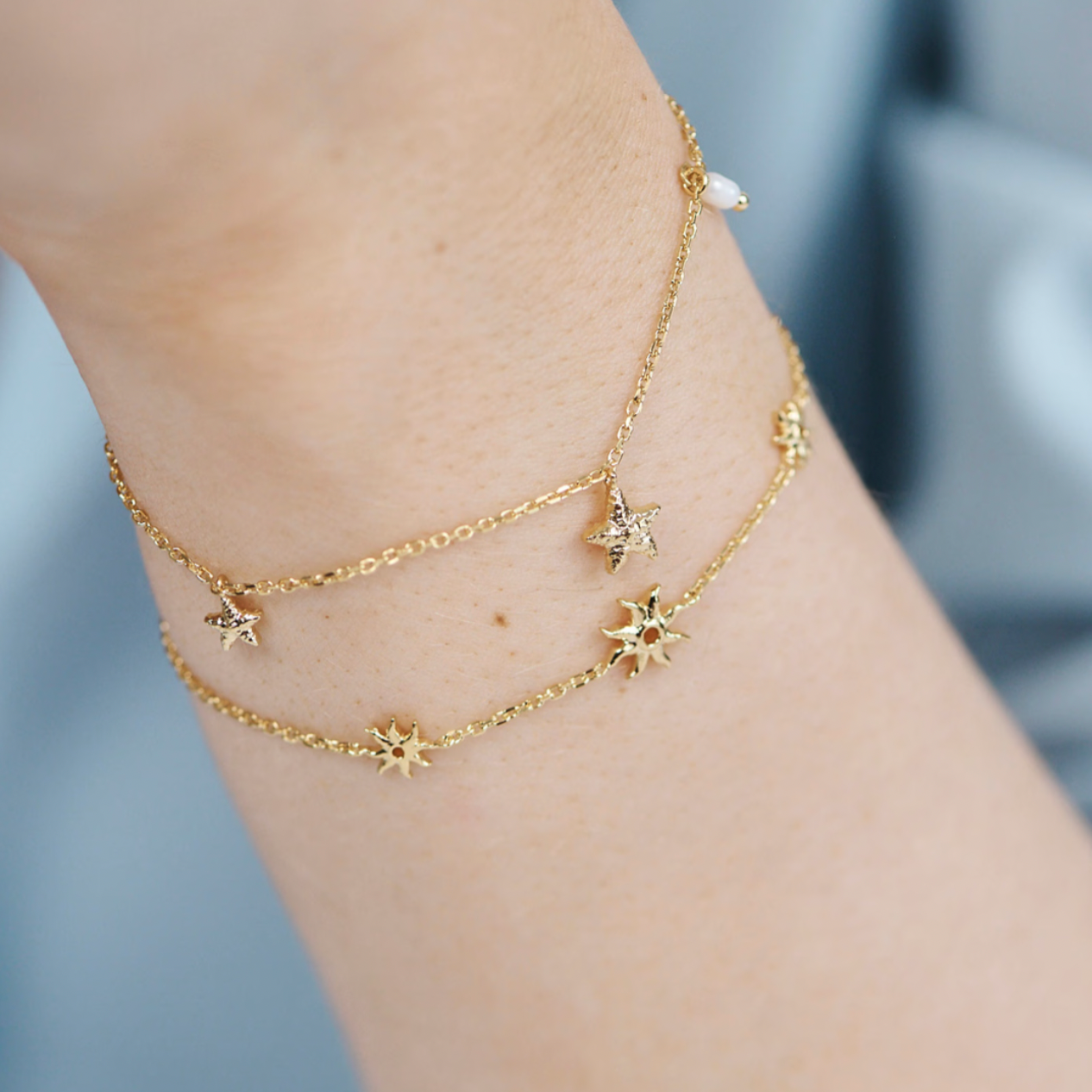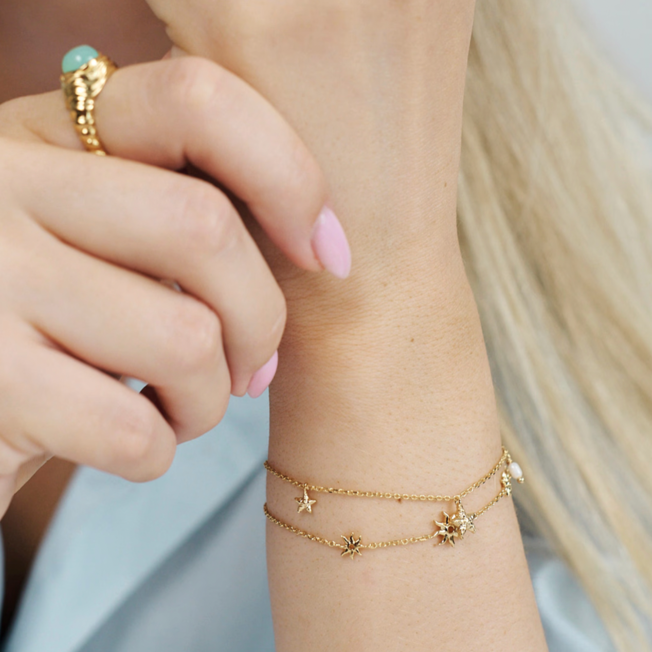 Ocean Aura armbåndet fra Studio Z er en elegant hyldest til havets energi og skønhed. Det er designet i forgyldt sølv og prydet med fine solmotiver, der bringer tankerne hen på varme stranddage og solens stråler, der glitrer på havets overflade. Den delikate kæde giver et let og feminint udtryk, perfekt til at tilføje et strejf af naturlig elegance til din smykkesamling. Et smykke, der stråler af lys og liv, uanset anledningen.