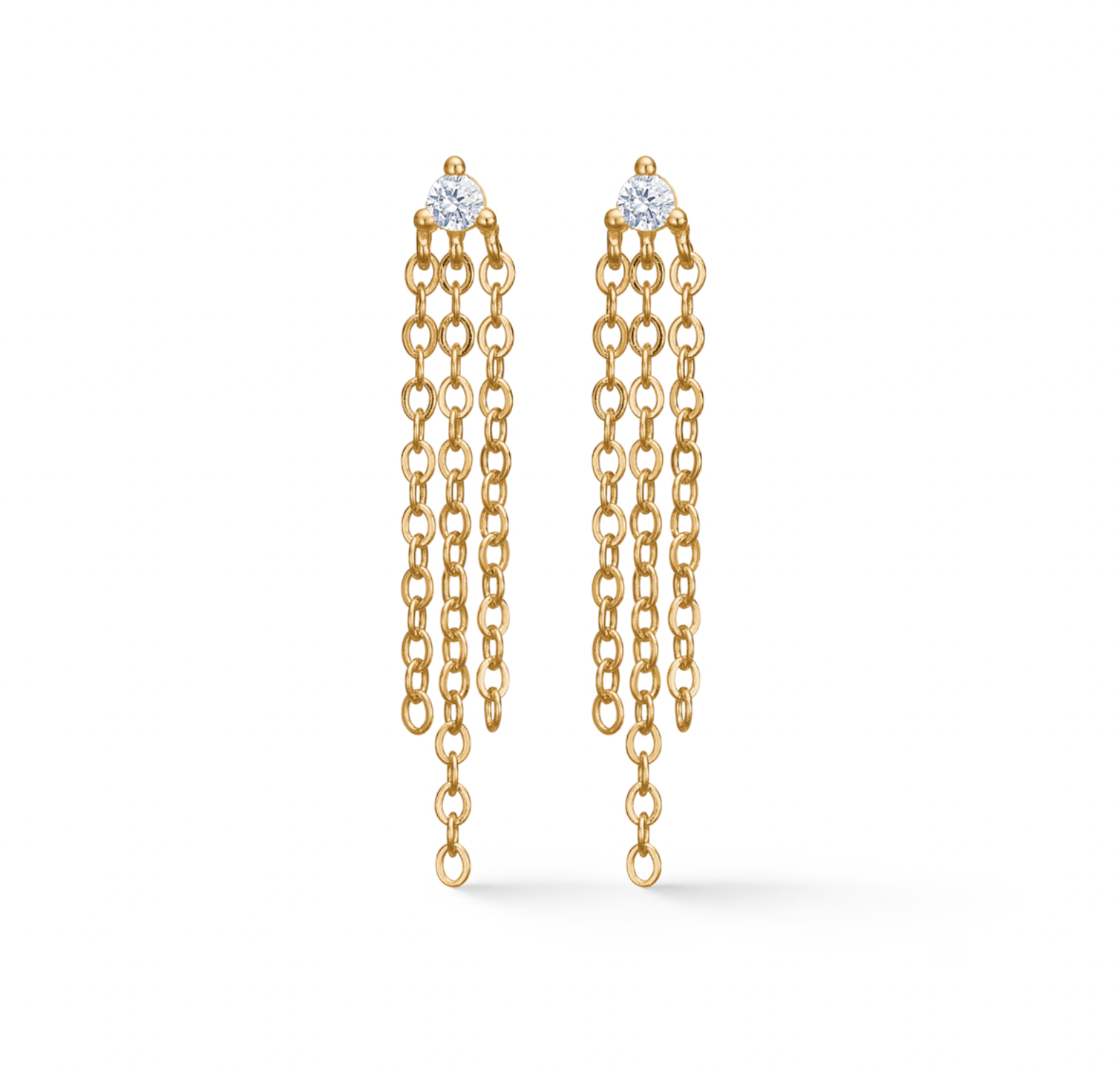 Ripple Øreringe i forgyldt sølv fra Studio Z kombinerer enkelthed, elegance og let bevægelse i ét raffineret design. Den smukke, funklende zirkonia-sten tilfører et eksklusivt glimt, mens de tre fine kæder hænger frit og fanger lyset, så hvert skridt giver smykket et dynamisk og levende udtryk. Denne ørering er ideel, når du ønsker at tilføre dit look en subtil, men markant detalje – uanset om det er til hverdagsbrug, en middag ude eller en festlig begivenhed.