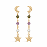 Designet forener små stjernevedhæng og halvmåner med en unik tekstur, mens de farvede sten tilfører dybde og nuance. En smuk ferskvandskulturperle fuldender looket med en elegant glød.