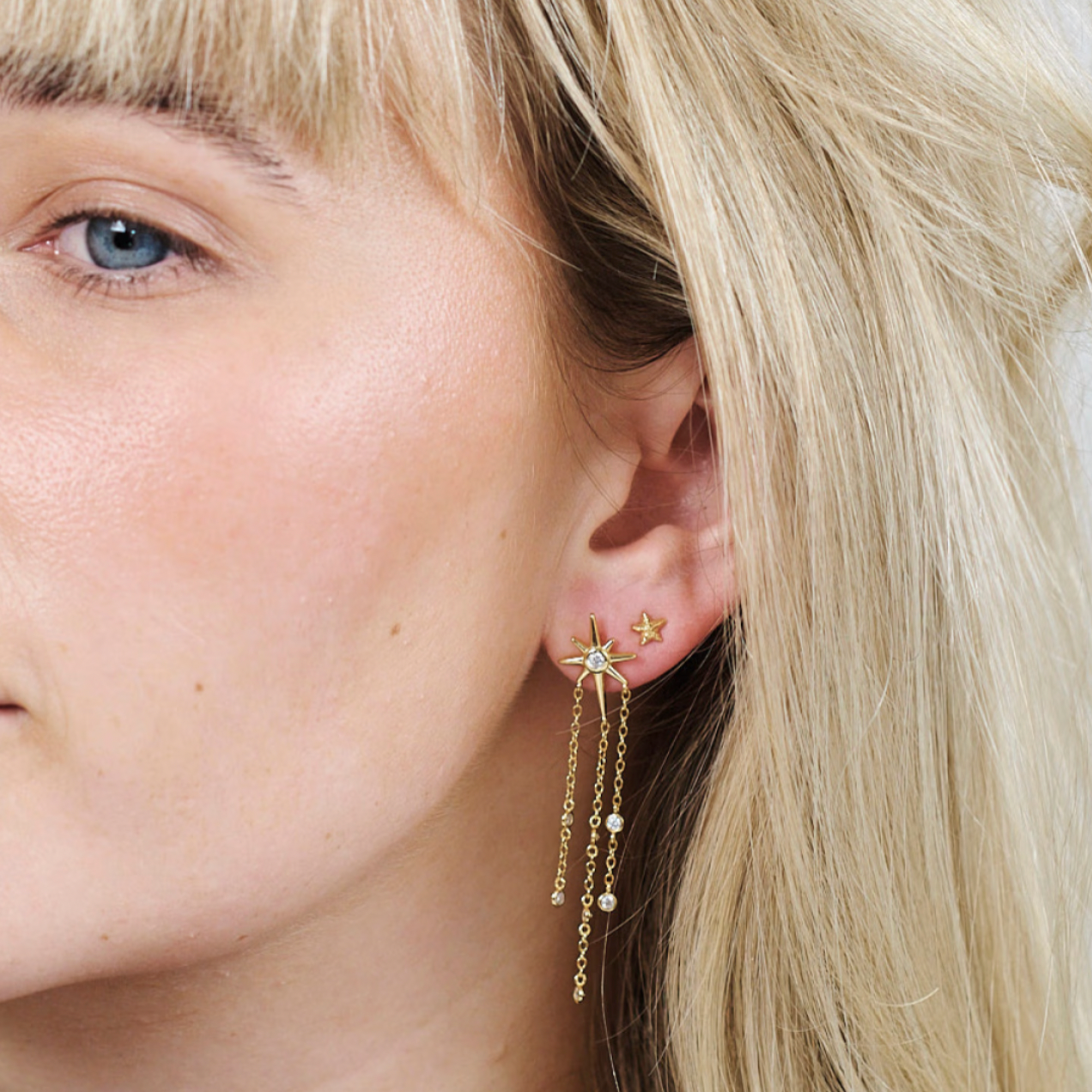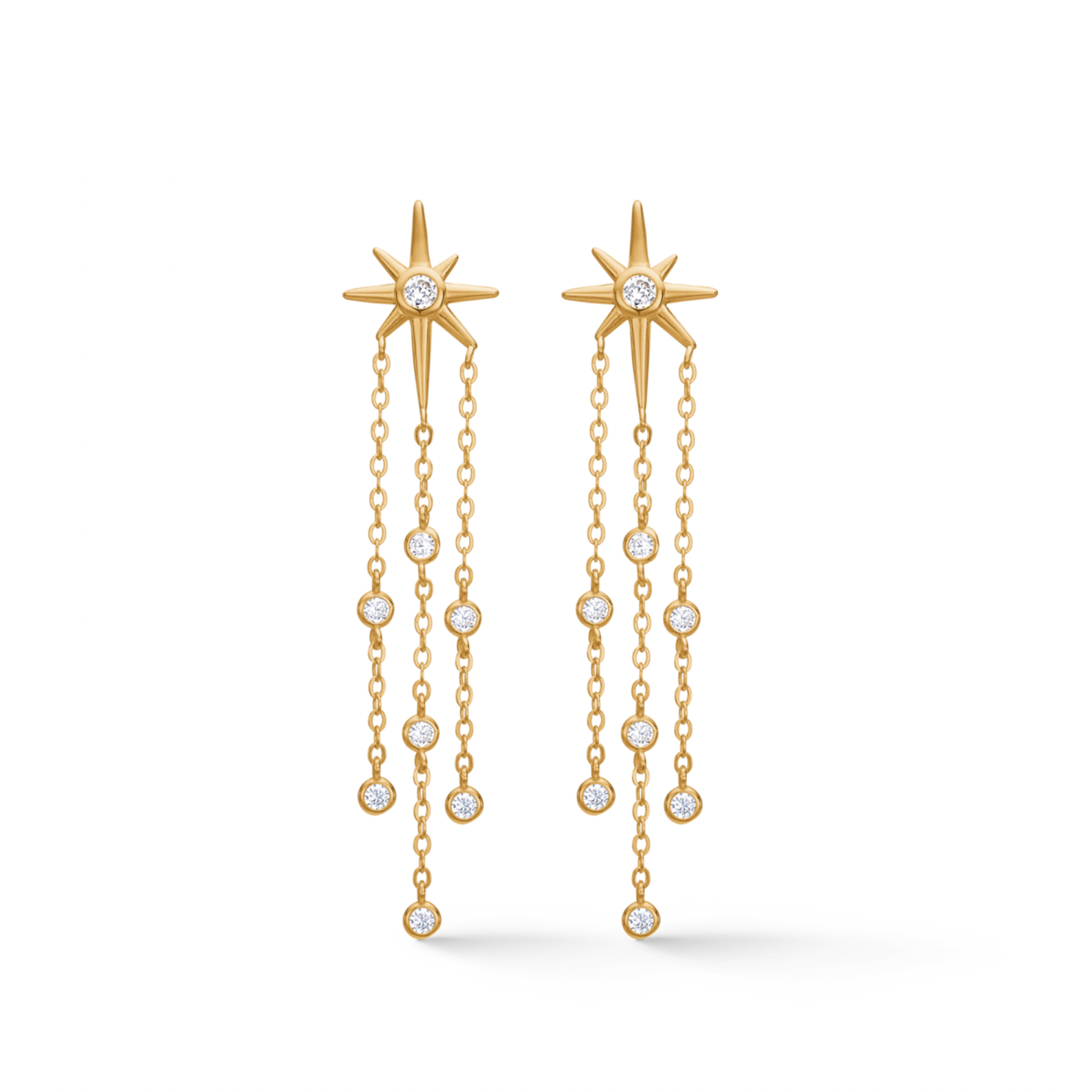 Twinkle Øreringe i forgyldt sølv fra Studio Z er elegante og iøjnefaldende med deres klare zirkonia-sten, der fanger lyset og skaber et strålende udtryk. Den lange, slanke silhuet tilfører et sofistikeret præg, hvilket gør dem perfekte til festlige anledninger, formelle outfits eller når du ønsker lidt ekstra glans i hverdagen.