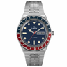 Q Timex Reissue TW2T80700 er et klassisk herreur med retroinspireret design og praktiske funktioner. Uret har en blå skive med selvlysende markeringer, dag- og datovisning ved kl. 3 samt en tofarvet drejekrans i rød og blå.